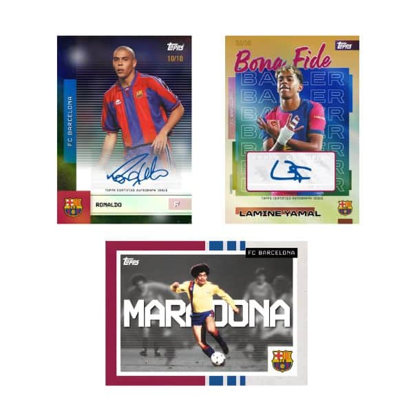 Incluye tarjetas base, insertos y autógrafos de futbolistas actuales y de grandes figuras históricas del club.